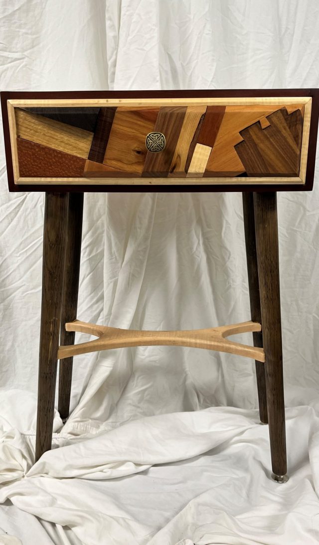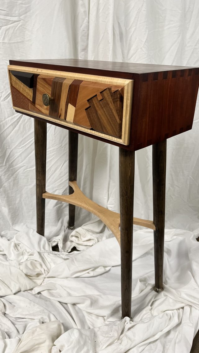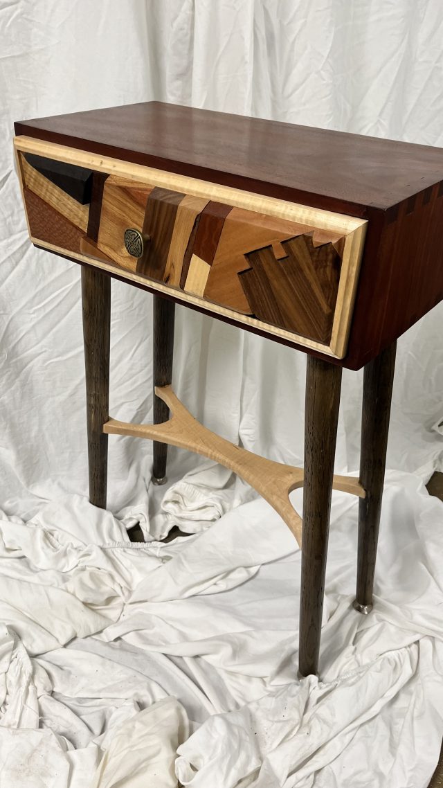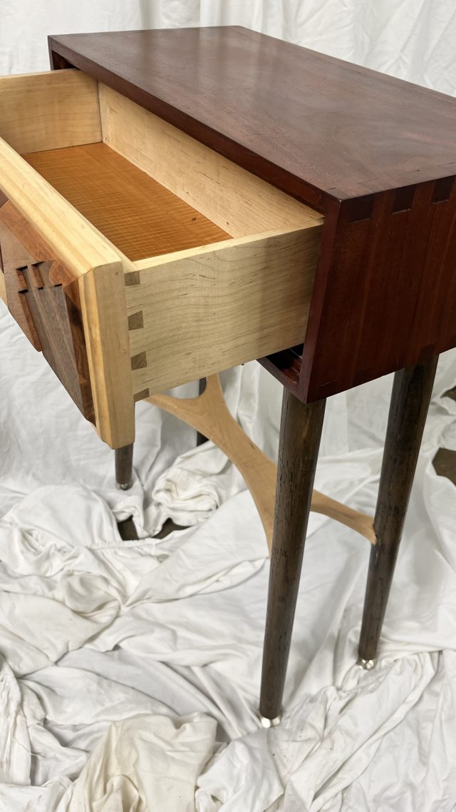 This glorious accent table was the product of staring at too many drops on the table, then placing more on top those to try to acheive a fun panel. The cabinet itself is mahogany that box joined. The legs were hand turned on the lathe, attached with a round through mortise and a wedge. The lower spreader is curly maple, and hand contoured with a rasp and spokeshave. The drawer slides are hidden self closing numbers. The drawers are dovetailed and curly maple.