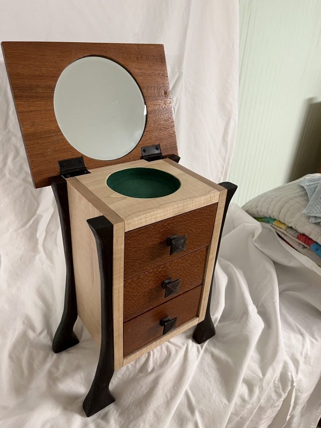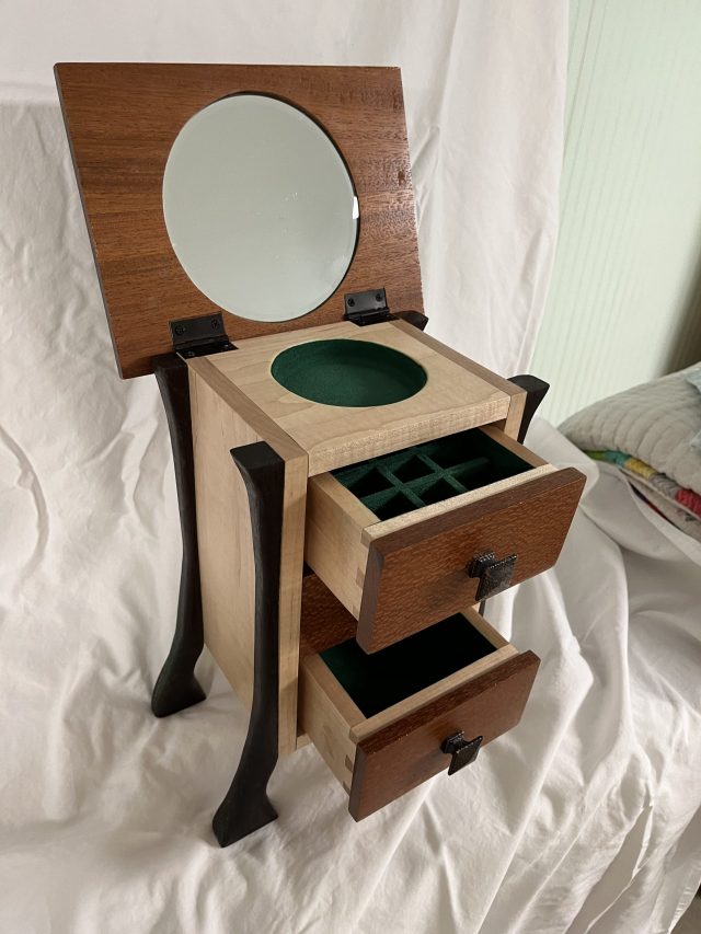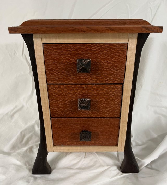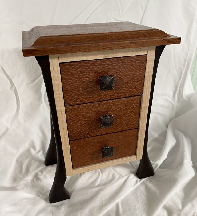 Gorgeous japanese inspired Jewelry box. Mahogany top, Wenge hand carved legs, curly maple body and drawer sides, Velvet lined drawers. Dovetailed drawers. With a ring holding drawer and divided drawer as well.