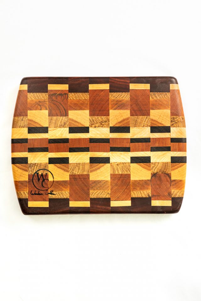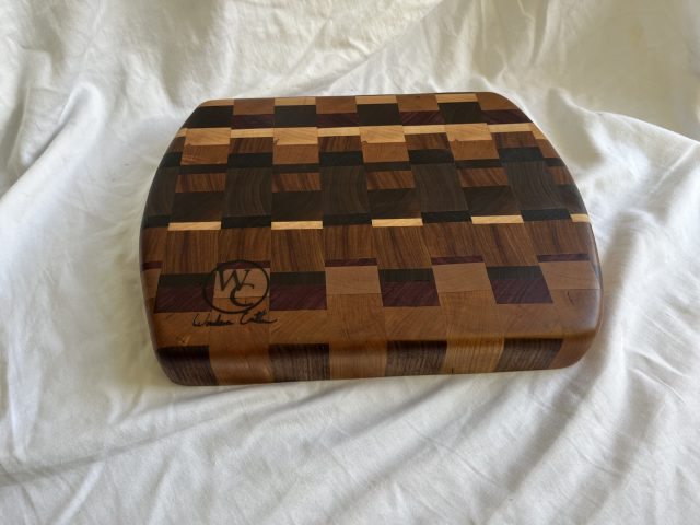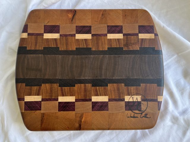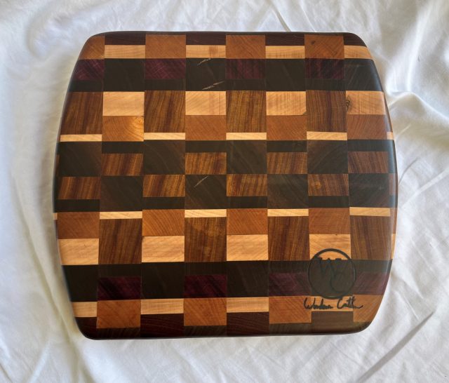 Contoured end grain cutting board out of Walnut, purpleheart, leopard wood, wenge, cherry, white oak, jatoba, mahogany and hickory. Roughly 12″ x 11″ x 2″, sanded to 2000 grit, buffed and polished to an extraordinary hand rubbed sheen. Please specify image requested, variations may occur otherwise