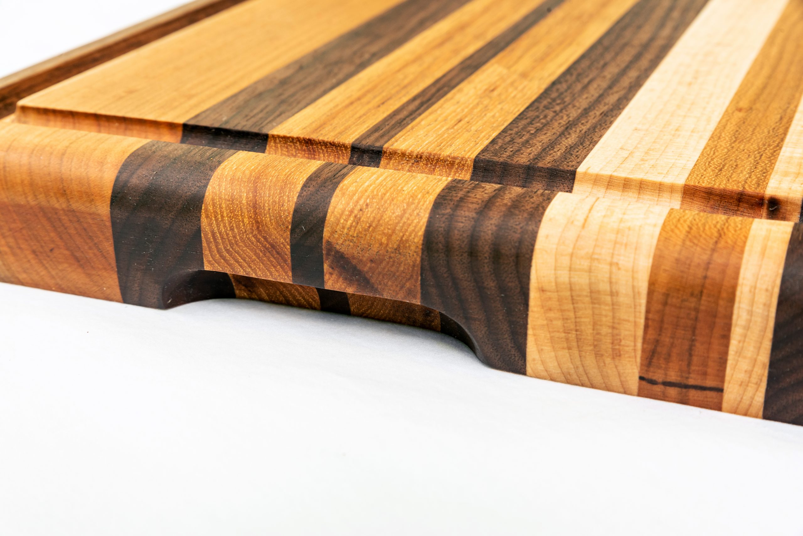 Look I’m not the cheapest, but good luck finding the thickness, the kind of hardwoods, the contours, handles, and finish anywhere close. 10″ x 12″x 2″ cutting board with juice edge.